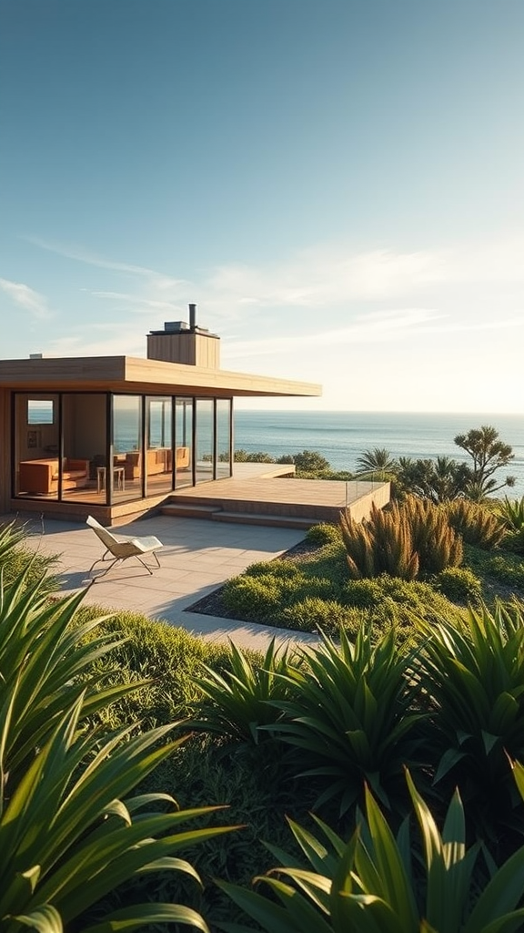 Hyper-realistic eye level exterior shot of a mid-century modern house with panoramic ocean views, captured in the gentle daylight with soft, indirect illumination. The architecture pays homage to the innovative designs of Frank Lloyd Wright, Charles and Ray Eames, and Mies van der Rohe, blending clean lines with natural materials. The house features expansive glass walls that open to the seascape, a flat roof with overhangs for shade, and a seamless flow between indoor and outdoor spaces. Lush landscaping with native plants frames the scene, enhancing the tranquil, immersive experience.