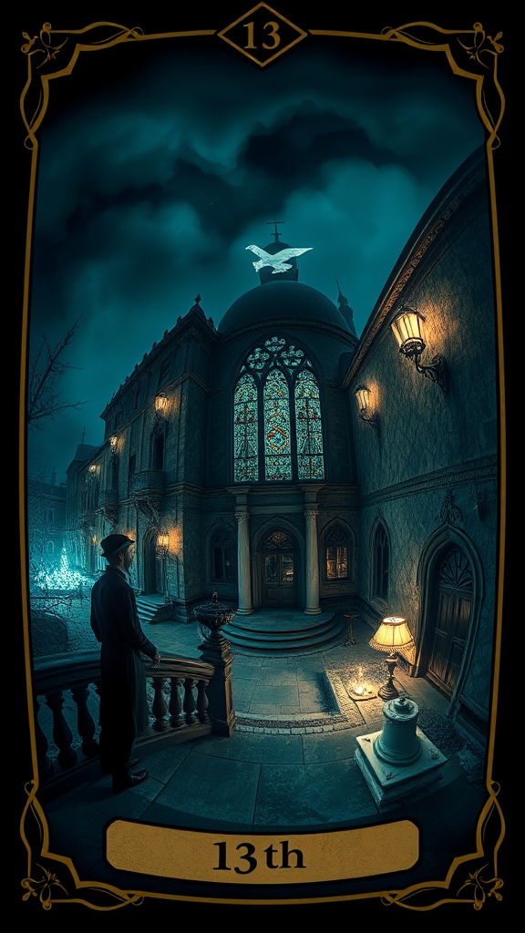 Hyper realistic fisheye exterior capture of a tarot card titled "13th" in a gothic style, overlooking a dramatic scene, with atmospheric, cinematic lighting and subtle, ambient illumination. The composition has the artistic flair of AD magazine, inspired by Tim Burton's unique aesthetic, combined with the modernist touch of Eames and the architectural precision of Mies van der Rohe. The setting evokes a sense of mystery and elegance, with intricate details and an imaginative interplay of shadows and light.