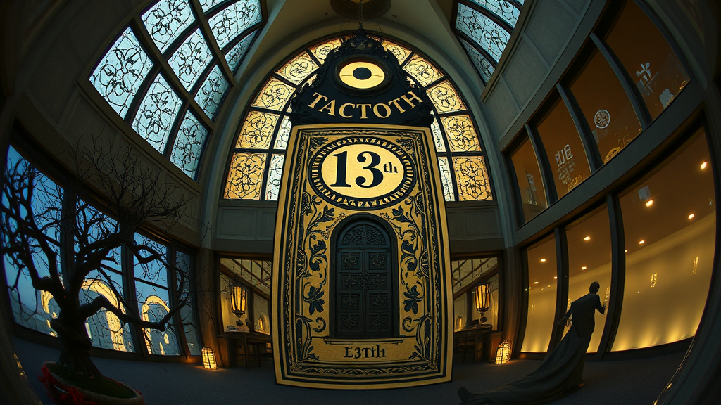 Hyper realistic fisheye exterior image of a gothic-style tarot card titled "13th," casting a watchful gaze over the scene. The setting is illuminated with cinematic indirect lighting reminiscent of an AD magazine shoot, infused with playful elements akin to Tim Burton's whimsical style. Architectural influences draw from the sleek elegance of Eames and the modernist touch of Mies van der Rohe, creating a surreal yet sophisticated atmosphere.