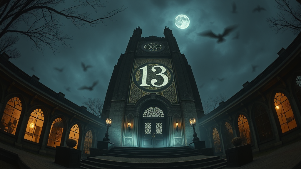 Hyper realistic fisheye exterior photo of a tarot card "13th" in a gothic style, towering over the scene with cinematic and indirect lighting, reminiscent of an AD magazine spread. Inspired by the eerie aesthetics of Tim Burton, combined with the modernist influence of Eames and Mies van der Rohe. The scene blends dark whimsy with sleek architectural elements, capturing a mysterious yet sophisticated atmosphere.