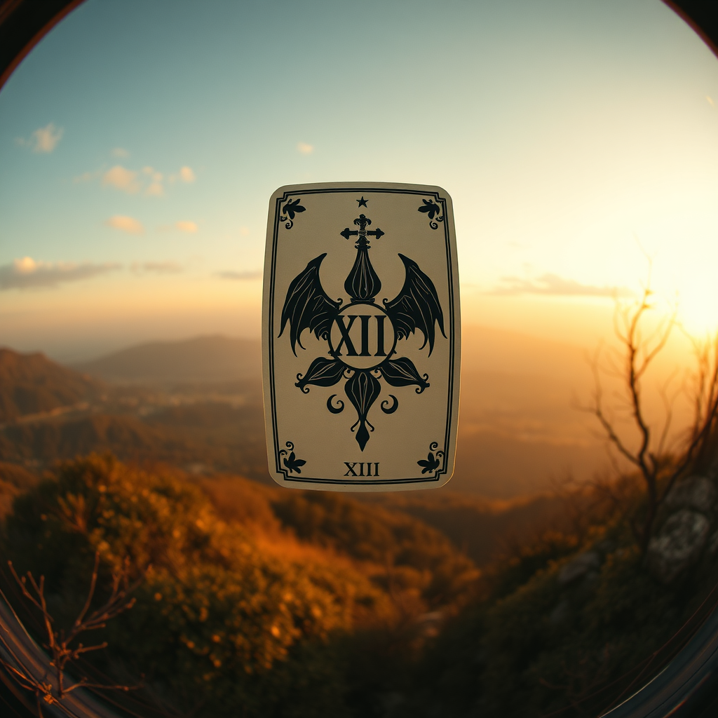 Hyper realistic fisheye exterior photo of a tarot card named “XIII” featuring gothic elements, elegantly hovering over a scenic backdrop with cinematic and indirect lighting. The atmosphere blends surreal charm and mysterious allure reminiscent of Tim Burton's whimsy. The scene captures the essence of mid-century modern design, influenced by the iconic aesthetics of Eames and the architectural grace of Mies van der Rohe. Subtle creative elements alter the familiar to evoke a fresh yet timeless narrative.