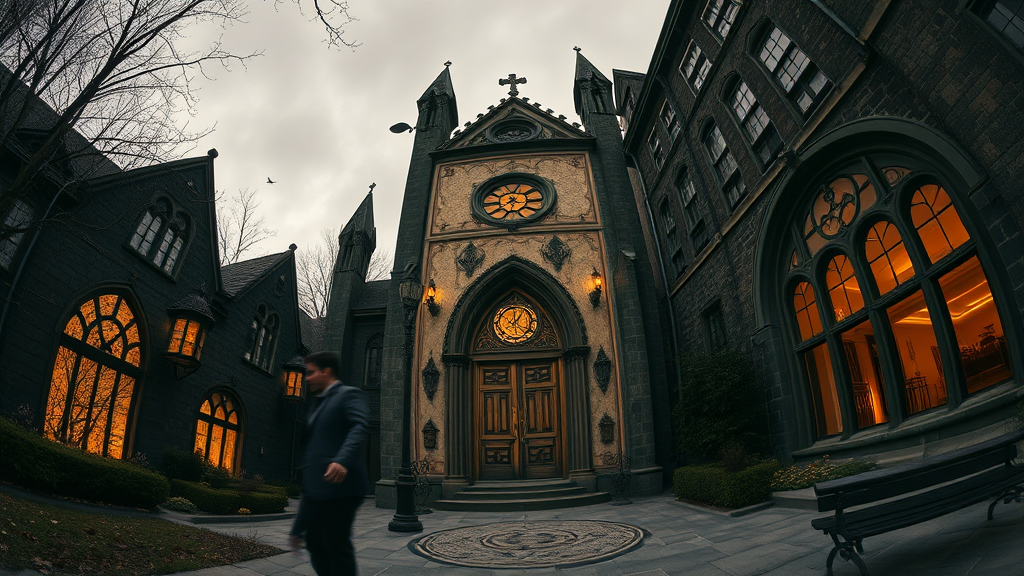Hyper realistic fisheye exterior photograph of a gothic-style "13th" tarot card, looming over the scene with cinematic and indirect lighting. Inspired by Tim Burton's whimsical yet dark aesthetic, this image captures the detailed textures similar to those featured in AD magazine. The modern lines of Eames and the architectural precision of Mies van der Rohe subtly influence the composition, adding an eclectic yet cohesive visual appeal to the scene.