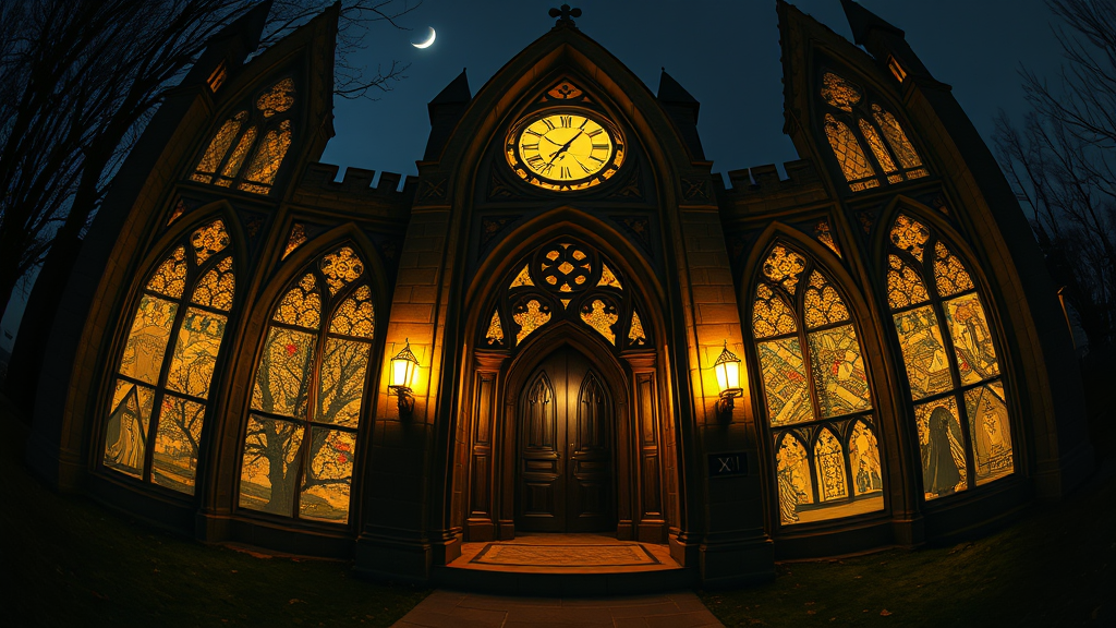 Hyper realistic fisheye exterior photograph of a tarot card labeled “XIII” in a gothic architectural style, casting an enigmatic presence over the scene, with cinematic and ambient lighting reminiscent of a Tim Burton film. The setting features influences of Eames and Mies van der Rohe, blending modernist structures with whimsical, dark aesthetics, as if a still from a high-end AD magazine editorial.