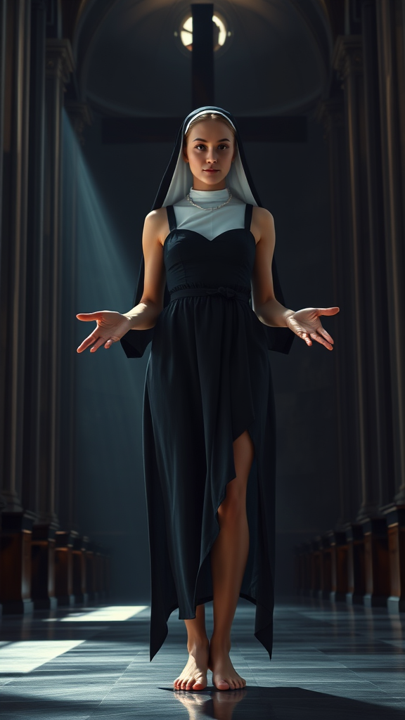 Hyper realistic full body view of a beautiful 20-year-old nun, characterized by long legs and a voluptuous figure with wide hips and delicate hands with long, slender fingers; an enigmatic energy emanates from her hands, gently hovering in the air. She is a young Catholic nun with a pretty, charming face, dressed in a skirt and black straps, barefoot, captured in a frontal view. A ray of light pierces through the shadowy ambiance of a grand church, casting dramatic and finely detailed shadows around her. In the backdrop stands a large, imposing cross, adding to the photorealistic and masterful composition of this 8k UHD wallpaper, where perfect lighting enhances the scene into a breathtaking masterpiece.