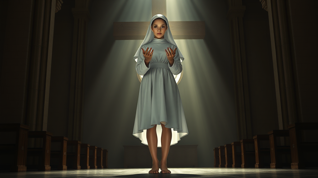 Hyper-realistic full body view of a stunning 20-year-old nun with an ethereal presence; she stands with grace, her long legs and prominent curves accentuating a serene elegance. Her delicate hands, with long, slender fingers, emit a mystical glow, creating an aura of mystery. She has a youthful, pretty, and captivating face framed by the traditional nun attire. Her skirt flutters slightly above her bare feet, adding a touch of innocence. The scene is set in a dimly lit church, where a ray of light pierces the shadows, illuminating her figure. Behind her, a large, intricately detailed cross serves as a powerful backdrop. The setting is a dramatic, photorealistic masterpiece with perfect lighting and finely detailed shadows, captured in 8k UHD.