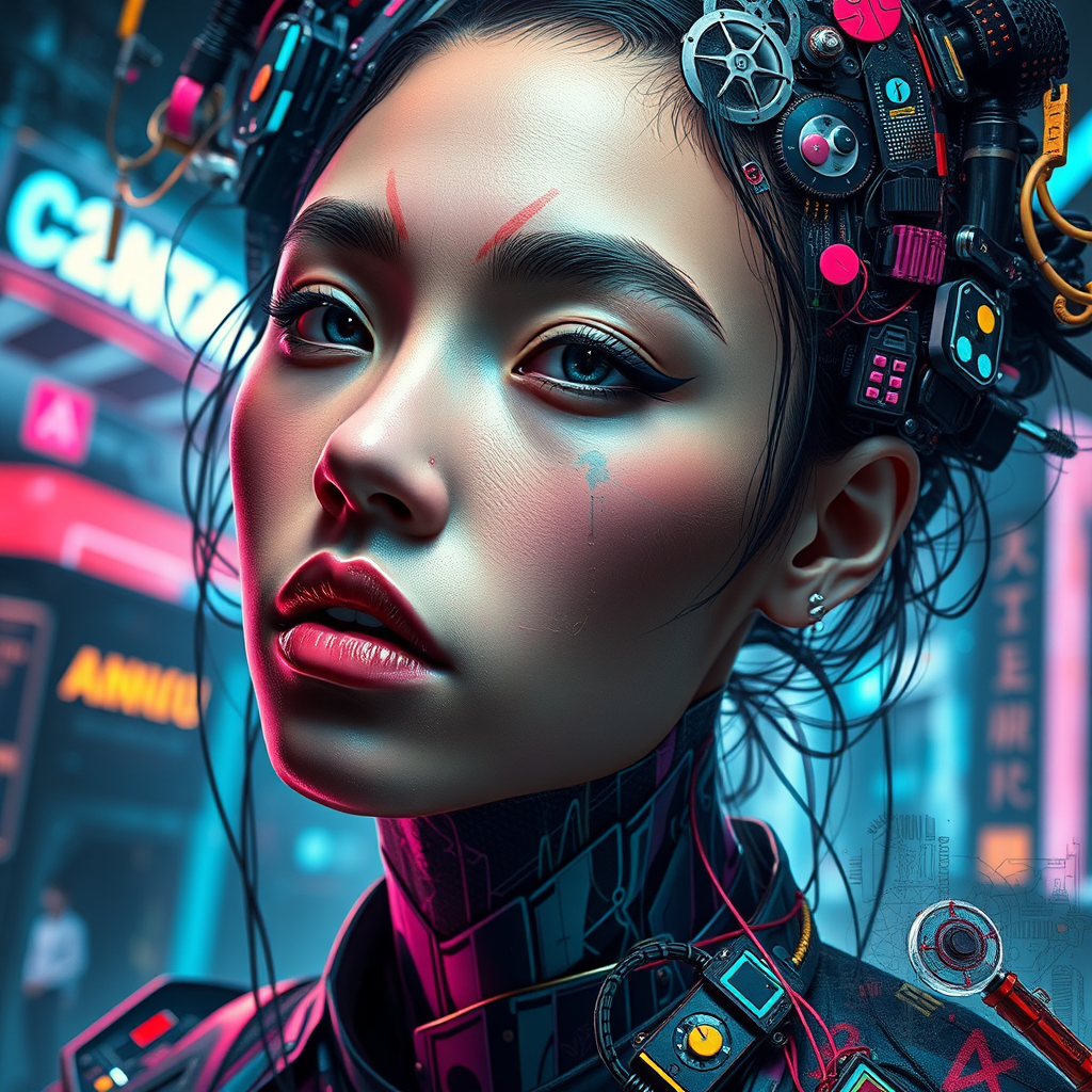 Hyper-realistic full-length portrait in the style of Stefan Kostic, featuring a vividly detailed and well-lit composition blending intricate abstract elements. Inspired by cyberpunk themes, the artwork embodies the complex artistry akin to Beeple, rendered with high detail and sharp focus using Octane Render. The scene captures a futuristic concept with dynamic ambient lighting, creating a sophisticated digital painting. This complex piece, suitable for 4K display, showcases a vivid and imaginative narrative, reminiscent of a striking Artstation showcase.