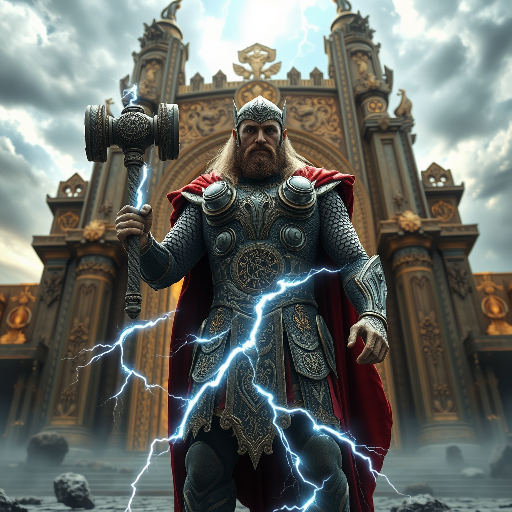 Hyper-realistic game character Thor the God of Thunder, adorned in elaborately intricate armor etched with ancient Norse symbols, wielding Mjölnir in his right hand, surrounded by crackling lightning energy; he stands poised at the majestic gateway of Valhalla, the golden hall of the honored slain. The scene radiates an aura of divine power and mythical grandeur, framed by the towering, intricately carved arches of Valhalla, with vibrant skies painted in a kaleidoscope of stormy greys and electric blues.