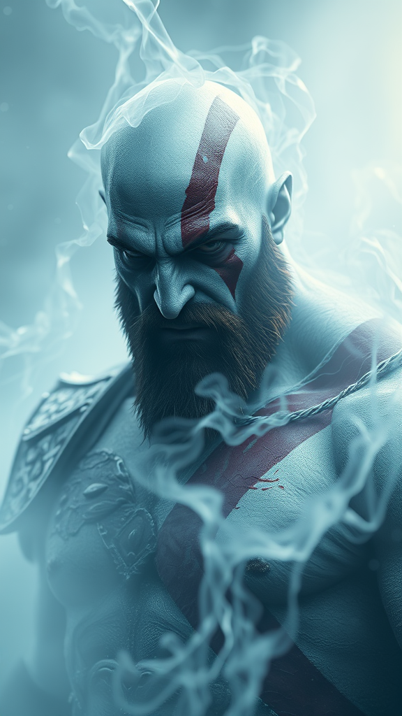 Hyper realistic God of War character design, Kratos as an arcane void master, enveloped in ethereal mist, photorealistic detail, rendered with octane and unreal engine 5, ultra-high 8k resolution, intricately detailed, soft volumetric lighting, HDR effects, deep shadows, --aspect ratio 9:16.