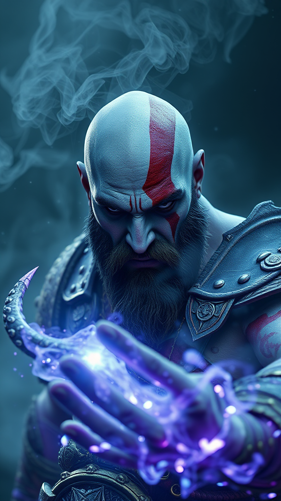 Hyper realistic God of War character design, Kratos, harnessing void magic, enveloped in ethereal mist, photorealistic, rendered with octane, unreal engine 5, 8k resolution, intricately detailed, enhanced with volumetric lighting and hdr, aspect ratio 9:16.