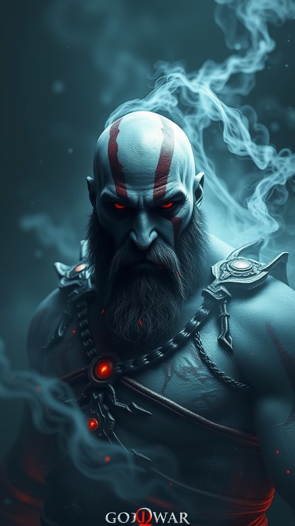 Hyper realistic God of War character design, Kratos as a void arcanist surrounded by swirling mist, photorealistic details using octane render and Unreal Engine 5, 8k resolution, hyper detailed textures, dynamic volumetric lighting, HDR effects, epic atmosphere, ethereal glow, dark magic aura, mythical ambiance --aspect ratio 9:16.