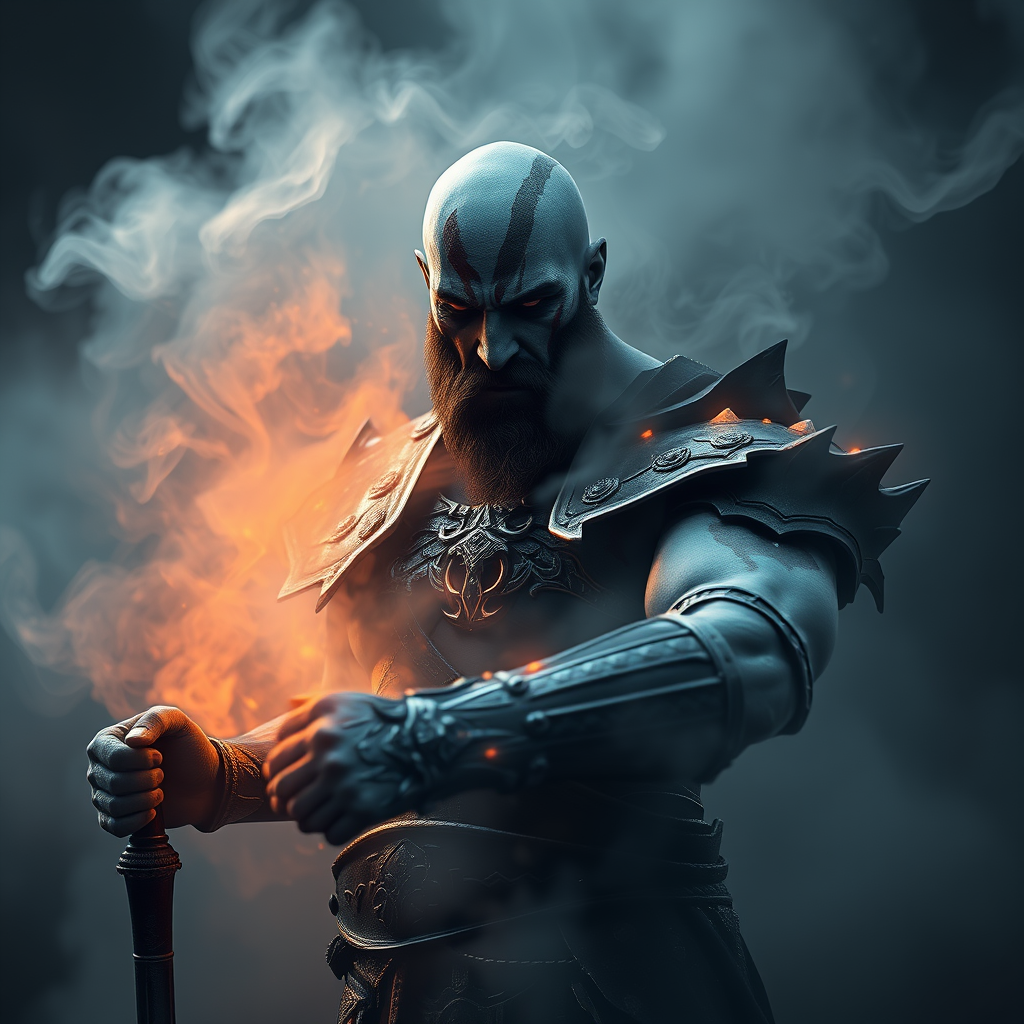 Hyper realistic God of War character design, Kratos as a void arcanist, enveloped in ethereal mist, ultra photorealistic, rendered with octane and unreal engine 5, 8k resolution, intricately detailed with volumetric lighting and HDR effects, aspect ratio 9:16. He wields shadow-infused weapons and his armor shimmers with a mystical glow amidst the swirling darkness.
