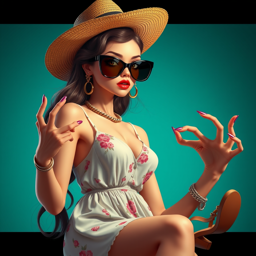 Hyper realistic, humorous anime featuring an exquisite high fashion model, showcasing high heels, sandals, and wide-brim hats paired with chic sunglasses. She wears a cool sun dress with a touch of 1960s retro futuristic flair, embodying a boho whimsical hippie vibe reminiscent of the American Gothic portrait style. The highly detailed face exudes supermodel beauty, crafted in the aesthetic of Charlie Bowater, Gil Elvgren, and Jack Hughes. Rendered in stunning 8k, UHD, and HDR, the image captures unique anomalies like a slightly elongated neck and quirky cross-eyed expression, as well as playful elements like extra fingers and mutated hands, adding to its distinct character. Avoid low-resolution outputs, ensure clarity, and maintain the integrity of the composition.