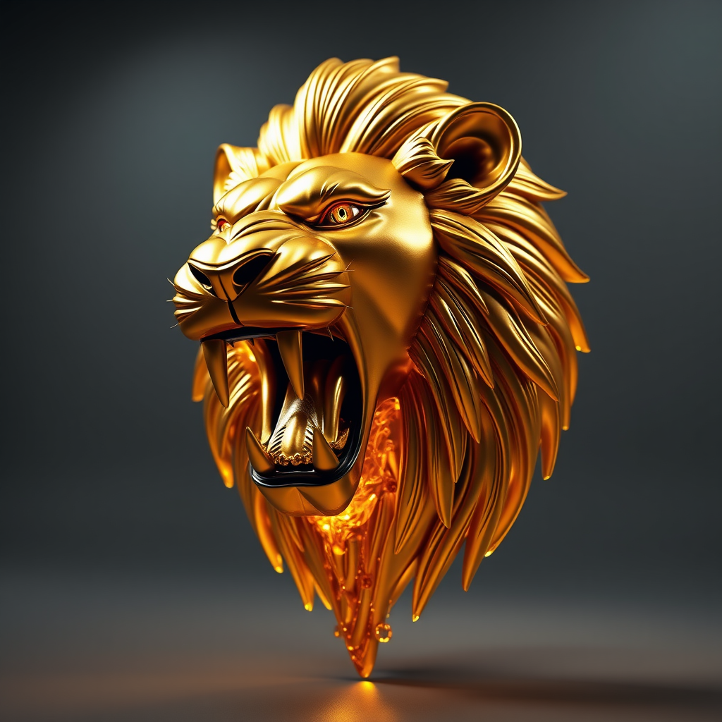 Hyper-realistic image, 3D render using Octane and Unreal Engine of a roaring lion head, shimmering with liquified gold, expertly lit in a studio setting, showcasing complex textures, ultra-detailed, 8k resolution, vivid and dynamic composition.