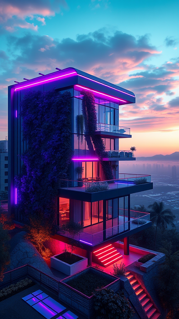 Hyper realistic image capturing the essence of a cyberpunk century modern house, perched at eye level and offering a sweeping vista of the horizon, features indirect lighting enhanced by ray tracing and a glow of neon accents throughout, surrounded by a landscape blending urban sophistication and futuristic design elements, a sleek facade reflecting a myriad of neon blues and purples, with lush vertical gardens that juxtapose the cutting-edge architecture, casting intriguing shadows that dance across the scene as if alive, subtle reflections on glass surfaces creating a mesmerizing interplay of light and depth.