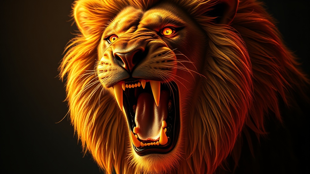 View this AI-generated image featuring hyper realistic 8k image 3d octane render featuring a lion head mid roar shimmering with molten gold cascading down its mane dramatic studio lighting showcasing fine intricate textures lifelike fur detail and dynamic expression evoking both power and opulence.
