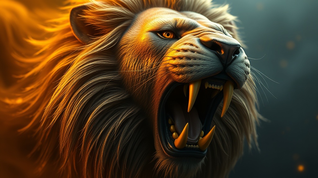 View this AI-generated image featuring hyper realistic image 3d octane render of a majestic lion s head in mid roar enveloped in shimmering gold accents detailed textures enhanced with cinematic lighting intricate fur details 8k resolution. Created using advanced AI technology, this image showcases