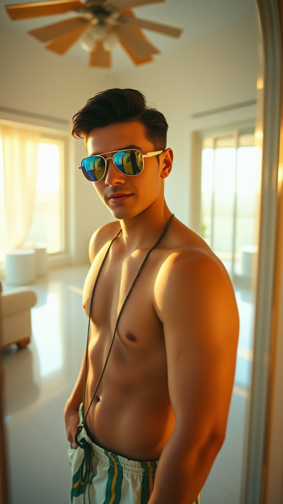Hyper-realistic image of an attractive man in stylish beachwear, wearing reflective sunglasses, captured on an iPhone 14 in a mirror reflection, short dark hair, bright and inviting room, subtle film grain reminiscent of Kodak Portra 800, shot at f1.8 during the warm glow of golden hour, aspect ratio 2:3, with soft shadows enhancing the relaxed atmosphere.