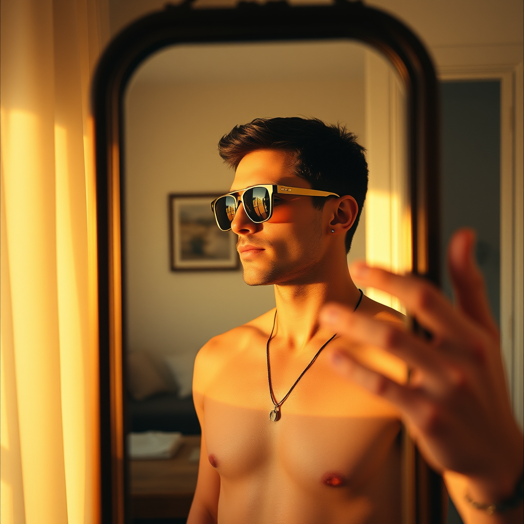Hyper-realistic image of an attractive man in stylish beachwear and sleek sunglasses, capturing his reflection in an iPhone 14 mirror shot. He has short, dark hair and stands in a cozy, brightly lit room. The scene is enhanced with the warmth of golden hour light, creating a nostalgic film grain effect reminiscent of Kodak Portra 800, with a shallow depth of field at f1.8 aspect ratio 2:3.