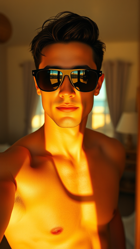 Hyper-realistic image of an attractive man in stylish beachwear and sleek sunglasses, captured in an iPhone 14 mirror selfie. He has short dark hair and is standing in a cozy, well-lit room that radiates warmth. The photo features a subtle film grain effect reminiscent of Kodak Portra 800, with a focus setting of f1.8 enhancing the golden hour glow. The composition is set in a 2:3 aspect ratio, offering an intimate glimpse into a serene and inviting atmosphere.