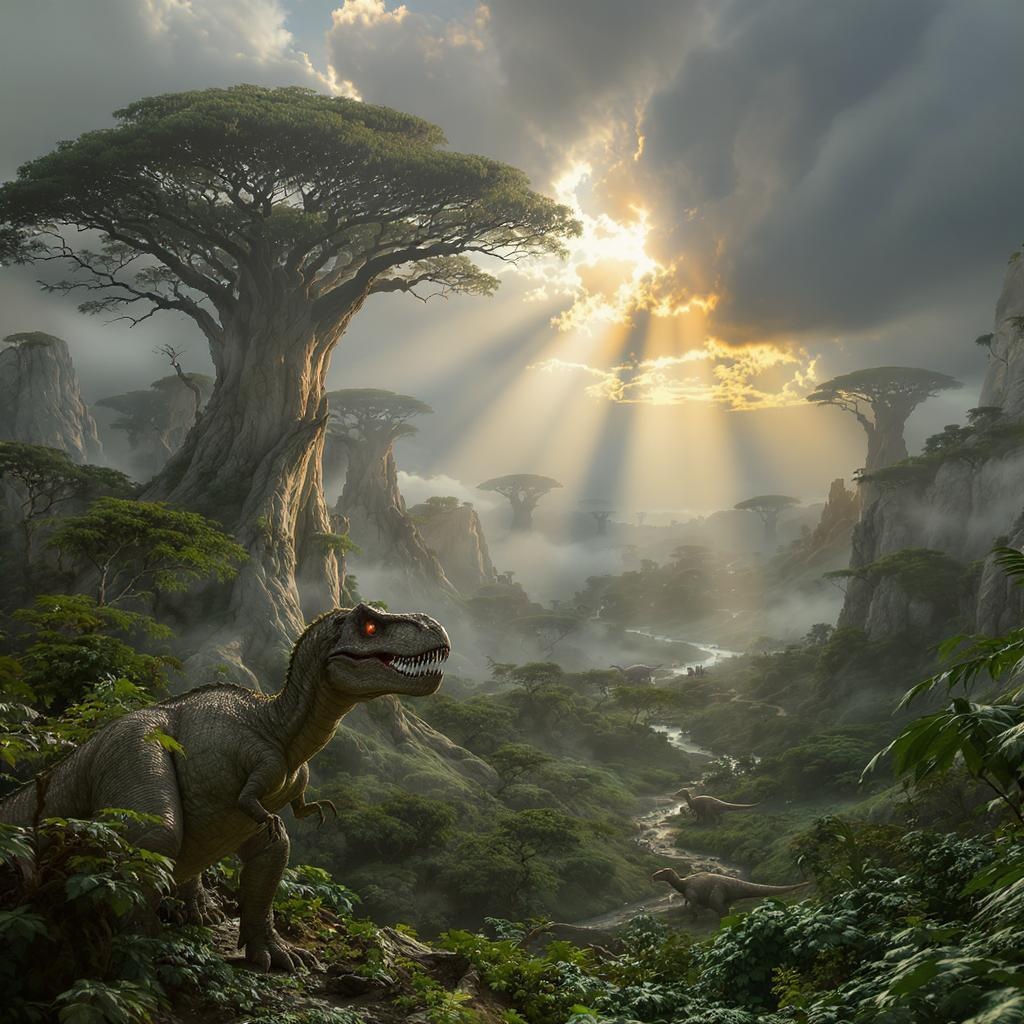 Hyper realistic landscape art of a Jurassic park scene, styled like Darek Zabrocki, featuring towering ancient trees and mist-shrouded cliffs, dinosaurs roaming a lush, verdant valley, UHD, 32k resolution, cinematic and epic in scale, with a dramatic sky illuminated by golden sunlight filtering through dense clouds, creating an atmosphere of awe and wonder, aspect ratio 2:3.