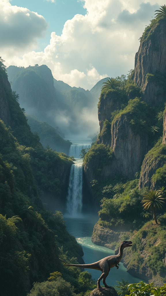 Hyper realistic landscape photoart of a prehistoric Jurassic world, capturing lush tropical vegetation and towering cliffs, in the style of Darek Zabrocki, 32k resolution, UHD, cinematic and epic atmosphere, ancient dinosaurs roaming amidst misty waterfalls and serene lakes, dramatic sky with dynamic cloud formations, --ar 2:3.