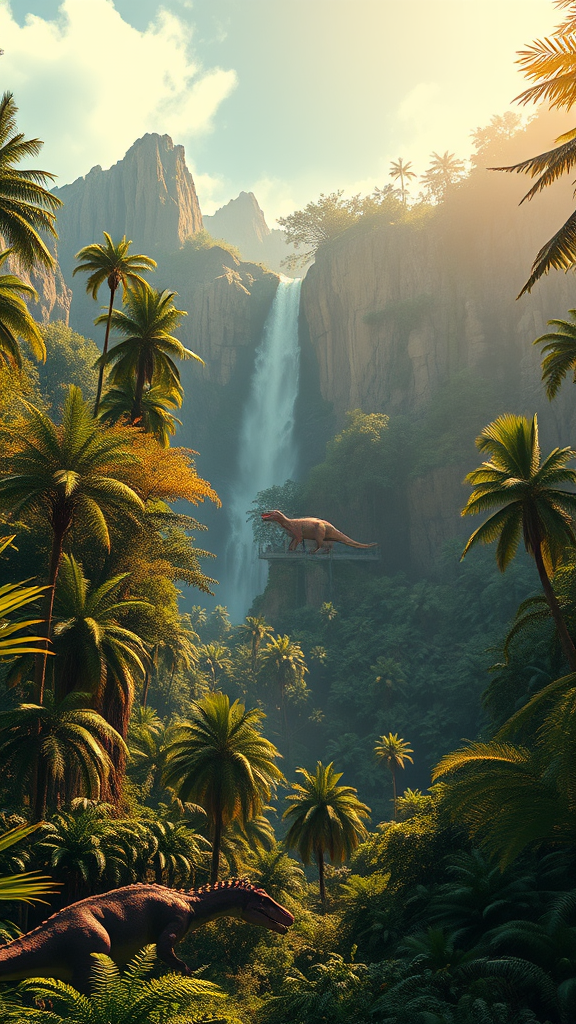 Hyper realistic landscape photoart of Jurassic Park, featuring lush, verdant jungles teeming with ancient ferns and towering trees, stylistically inspired by Darek Zabrocki's dynamic and textured brushwork, illuminated by warm, golden sunlight casting dramatic shadows and highlights across the scene, dinosaurs majestically roaming in the foreground, a waterfall cascading over rugged cliffs in the background, detailed atmospheric perspective providing a sense of depth and scale, 32k resolution, UHD, cinematic, epic, showcasing an impressive balance between untouched nature and primal beauty, all framed in a striking 2:3 aspect ratio.