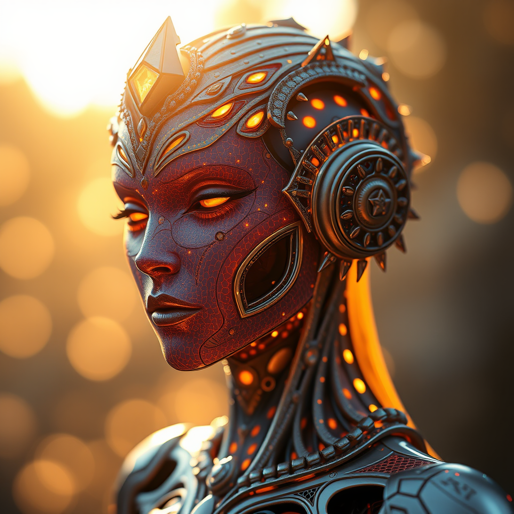 Hyper-realistic medium shot portrait featuring a hyperdimensional artificial humanoid being with stunning intricately detailed design. The being exhibits regularly textured bioluminescent skin that shimmers beautifully, enhanced by ornate, hyper-futuristic elements. The character appears bathed in the warm glow of the golden hour, surrounded by a soft bokeh effect that adds depth and atmosphere. This digital art piece is beautifully rendered, drawing inspiration from the artistic styles of Tooth Wu, Wlop, Android Jones, Beetle, and Greg Rutkowski. The overall aesthetic is both otherworldly and mesmerizing, capturing a sense of serene elegance and advanced technology.