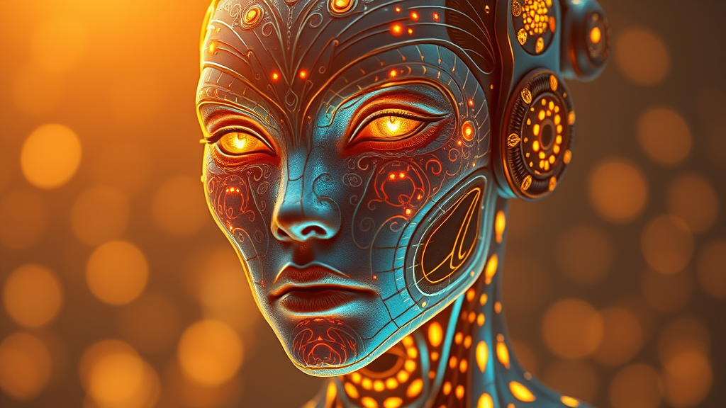 Hyper-realistic medium shot portrait of a hyperdimensional artificial humanoid entity, featuring exquisitely intricate details. The being boasts regularly textured, bioluminescent skin, decorated with ornate, hyper-futuristic patterns. Inspired by visionary artists from ArtStation, its design captures the essence of golden hour with subtle bokeh effects. The creature's visage showcases digital artistry reminiscent of Tooth Wu, WLOP, Android Jones, Beetle, and Greg Rutkowski. Its ethereal appearance transcends ordinary realms, merging organic and synthetic aesthetics into an extraordinary visual narrative, set in a 2:3 aspect ratio.
