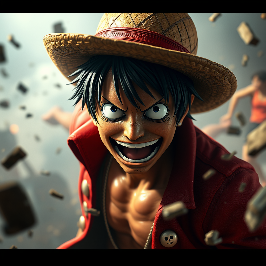 Hyper realistic One Piece character design of Luffy with a misty atmosphere, photorealistic details rendered with Octane Render and Unreal Engine 5, resolution in 8k, featuring hyper detailed textures and dynamic volumetric lighting. The scene captures a furious combat, set against a backdrop of chaos and conflict, with swirling debris and intense action. Luffy's iconic straw hat is slightly askew, and his expression embodies determination and grit. The lighting emphasizes the tension and energy of the battle, creating an immersive and dramatic visual experience.