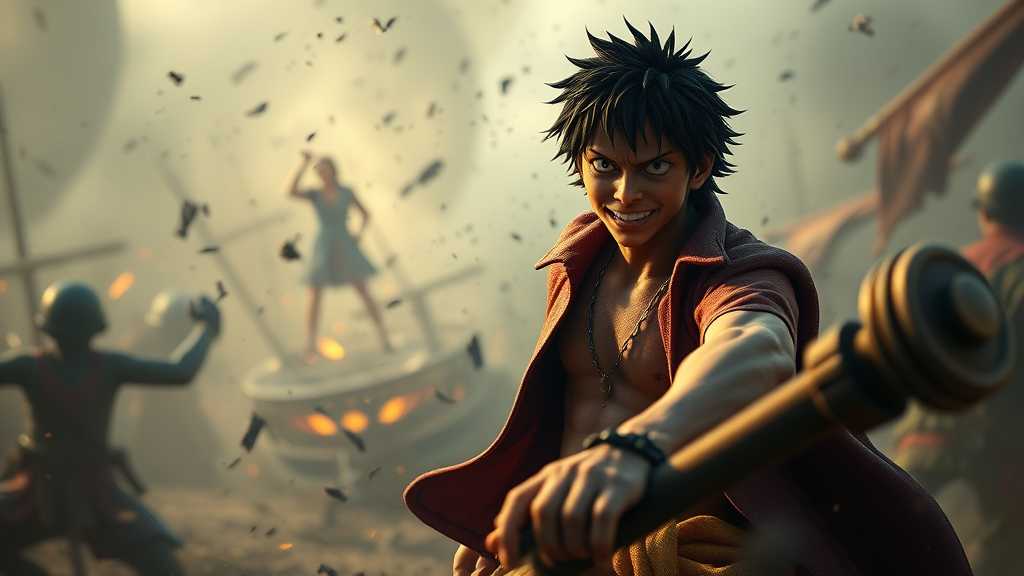 Hyper realistic one piece character design of Luffy in a chaotic and misty battle scene with photorealistic details, rendered using octane and unreal engine 5 in 8k resolution, featuring hyper detailed textures and volumetric lighting, enhanced by dynamic HDR effects to capture the intensity of raging combat amidst a backdrop of chaos and conflict, incorporating subtle creative elements to bring a fresh perspective to the scene.