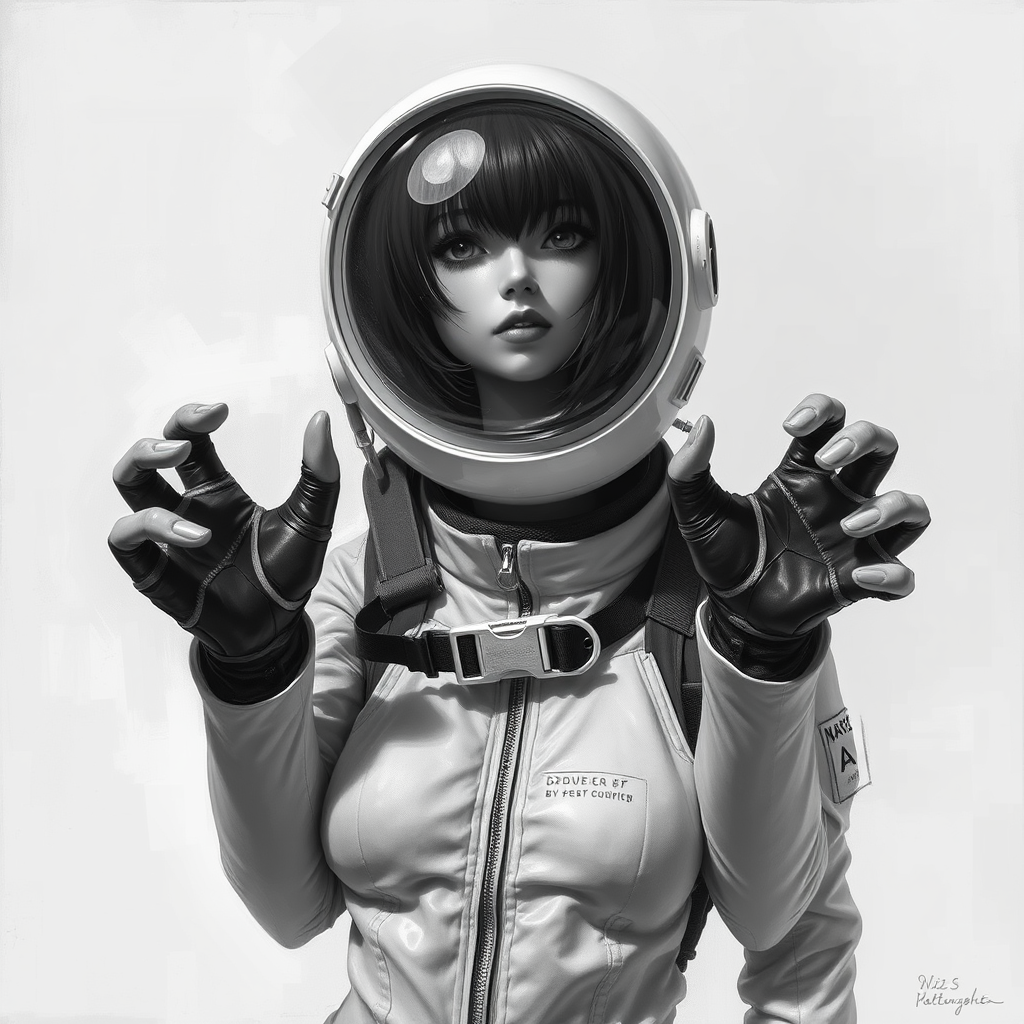Hyper realistic painting of a stunning girl in an EVA plugsuit, intricately detailed, anime style, inspired by the works of Greg Rutkowski, popular on art platforms with digital compression effects, intentionally low quality and low resolution, 3D rendered appearance, resembling a doll with a plastic texture, incorporating elements of blur and haze, monochrome aesthetic in black and white, featuring illegible text, distorted anatomy with twisted hands, oddly shaped body, absent limbs and fingers, tentacle-like fingers, excessive limbs, oversized fingers, presence of watermarks and logos, flawed anatomy, and disproportional features.