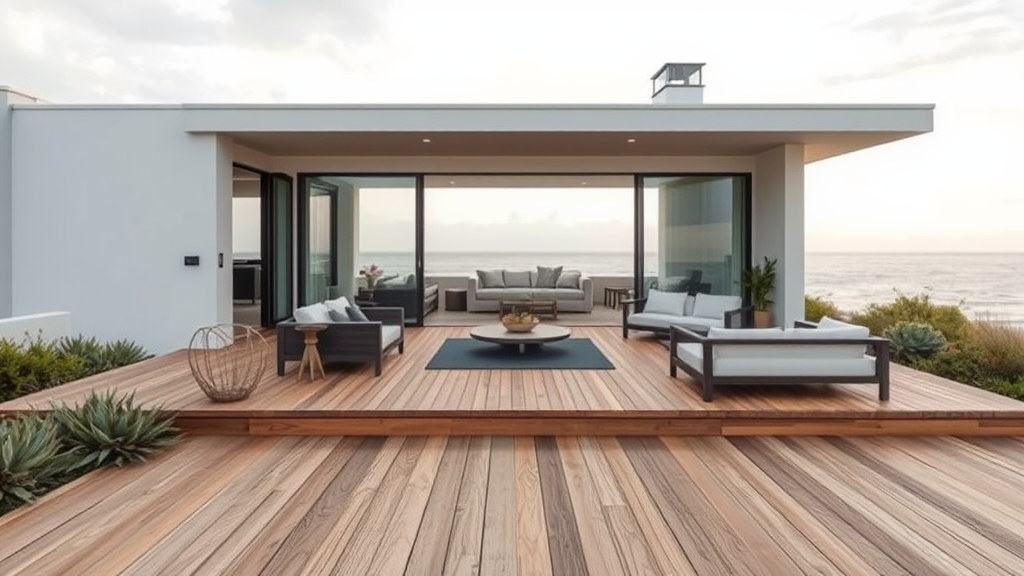 Hyper realistic photo capturing the exterior of a mid-century modern style house positioned at eye level, nestled against a backdrop of the ocean under soft daylight, showcasing indirect lighting. The architecture blends elements reminiscent of Frank Lloyd Wright, the Eames, and Mies van der Rohe, with clean lines and expansive glass windows. A spacious wooden deck extends from the minimalist structure, adorned with sleek, contemporary outdoor furniture. Native coastal plants dot the landscape, adding a natural charm, while the gentle sound of waves can almost be heard in this serene, sophisticated setting.