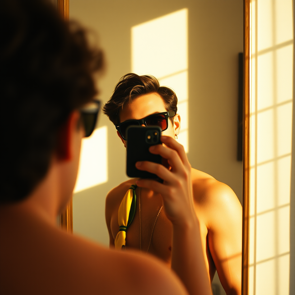 Hyper-realistic photo, charming man in tropical beachwear, stylish sunglasses, captured with iPhone 14 in a mirror, short wavy dark hair, sunlit cozy room, subtle film grain, shot on Kodak Portra 800, f1.8, warm golden hour glow, soft shadows dancing across the walls --portrait aspect ratio 2:3.