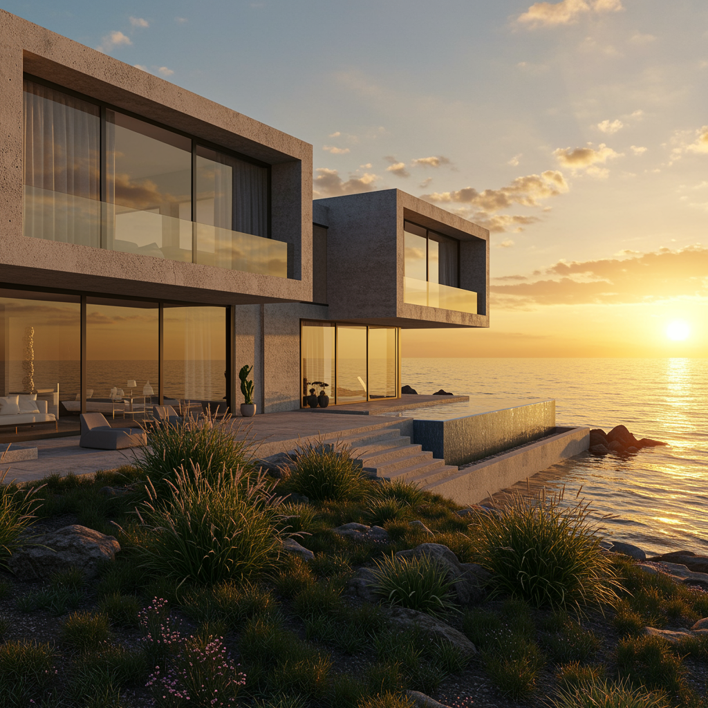 A breathtaking 8K hyper-realistic photo of a stunning modern house showcasing sleek concrete edges and expansive glass walls, beautifully embodying 21st-century architectural style. The house is elegantly perched by a vast, tranquil sea, with the golden hour sun casting warm, radiant hues across the scene, enhancing its serene ambiance. In the foreground, a meticulously designed garden with native coastal plants adds a natural touch, while the gentle waves mirror the sky's vibrant colors, creating a mesmerizing reflection. The architectural masterpiece seamlessly blends with its surroundings, capturing the essence of luxury and tranquility in one captivating image.