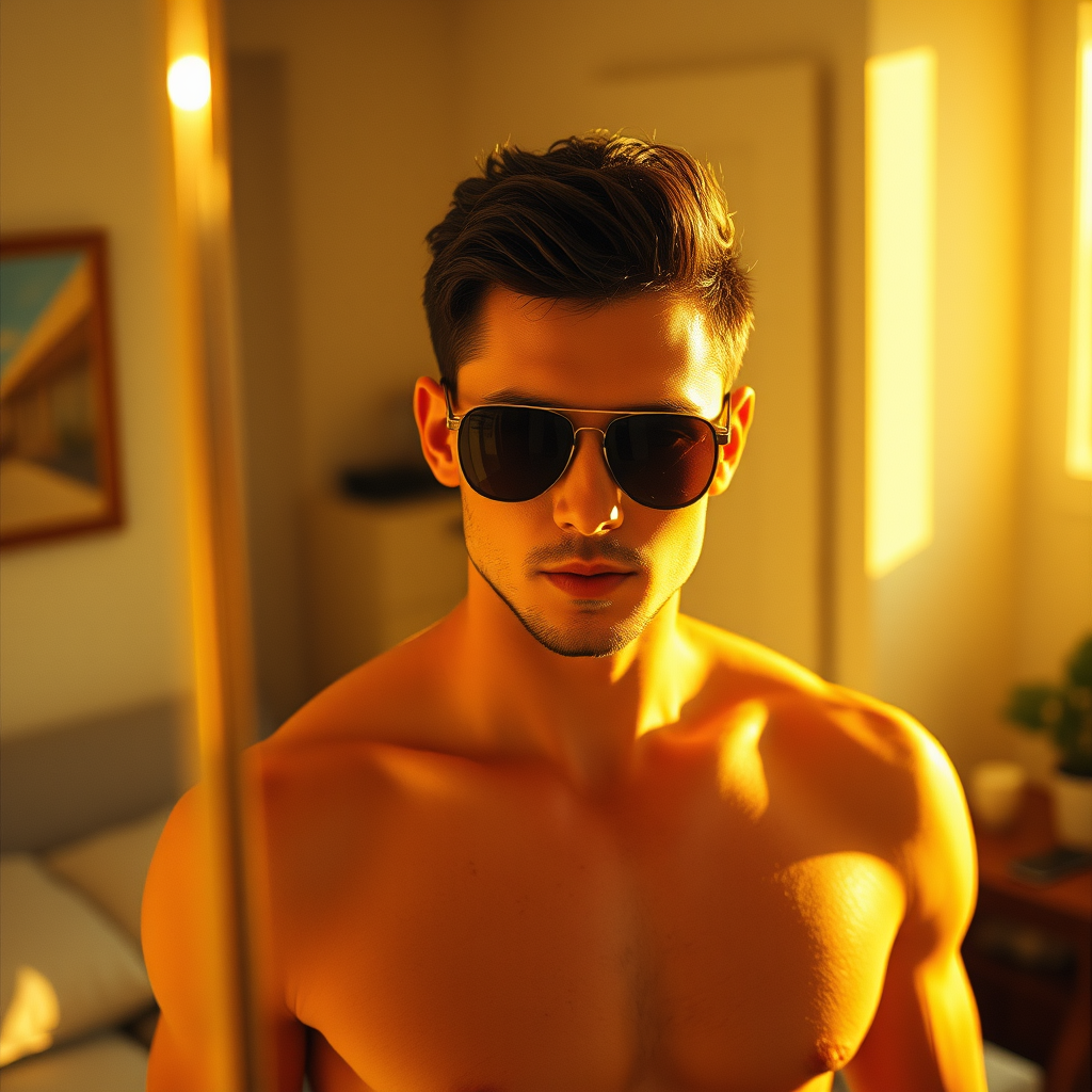 Hyper-realistic photo of a strikingly handsome man in stylish beachwear, sporting sleek sunglasses, captured on an iPhone 14's camera through a mirror reflection. He has short, dark hair and is standing in a cozy, sunlit room. The warm ambiance suggests it's golden hour, casting a soft, flattering glow. The image features a subtle film grain akin to Kodak Portra 800, with a shallow depth of field at f1.8, accentuating the relaxed and vibrant atmosphere.