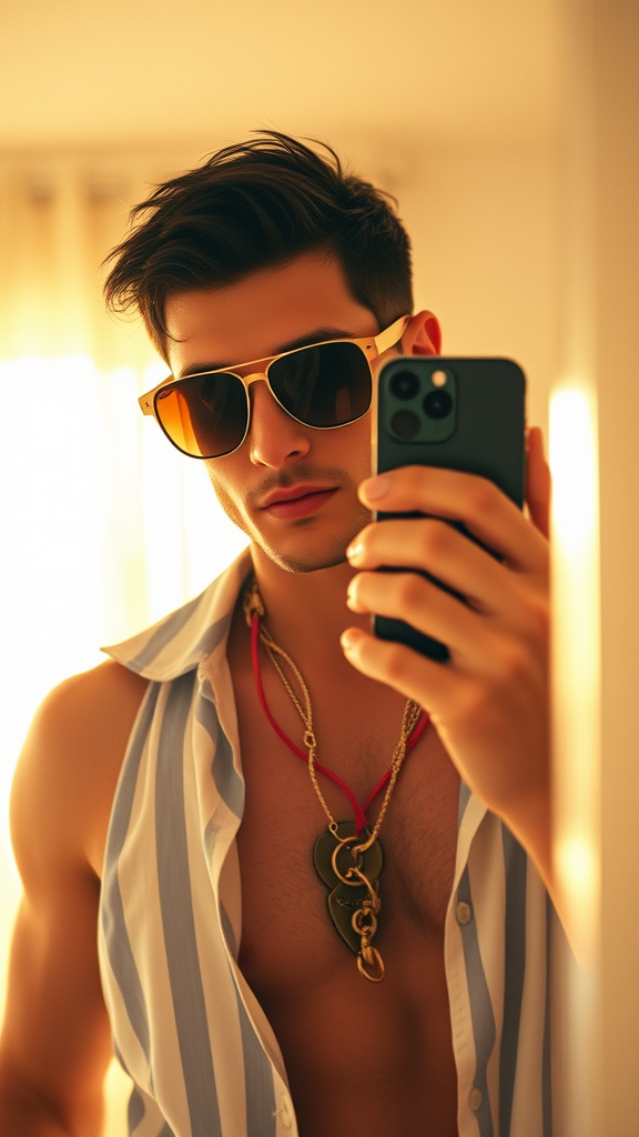Hyper-realistic photo of a strikingly handsome man in stylish beachwear and chic sunglasses, capturing himself in the mirror with an iPhone 14. He has short, dark hair and is standing in a luminous, inviting room. The scene exudes a warm, nostalgic feel akin to a Kodak Portra 800 film with a hint of film grain. The soft focus at f1.8 beautifully accentuates the golden hour glow, casting a gentle, flattering light on his features. The photo aspect ratio is 2:3, emphasizing the serene atmosphere.