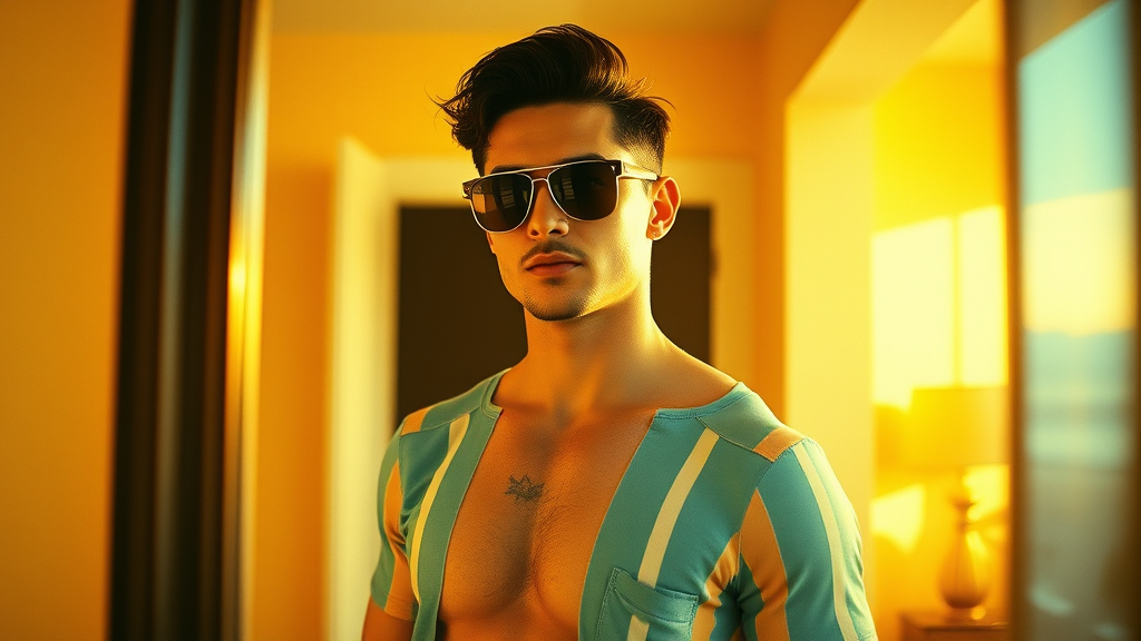 Hyper-realistic photo of a strikingly handsome man wearing stylish beachwear and sleek sunglasses, captured on an iPhone 14 in a mirror. He has short, dark hair and stands in a warm, inviting, brightly lit room. The image is infused with a nostalgic film grain reminiscent of Kodak Portra 800, with a shallow depth of field at f1.8, and is bathed in the soft, glowing light of golden hour, creating a perfectly balanced composition.