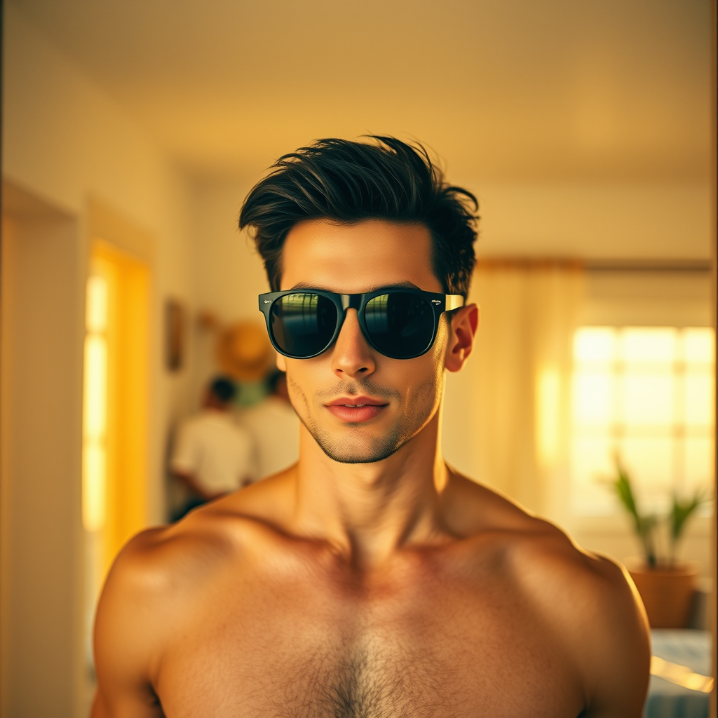 Hyper-realistic photo of a strikingly handsome man in stylish beachwear, sporting sleek sunglasses, captured in the reflection of an iPhone 14 mirror shot. His short dark hair is perfectly styled, and he stands in a warmly lit, inviting room filled with natural light. The image has a film grain texture reminiscent of Kodak Portra 800, shot at a wide aperture of f1.8 during the golden hour, enhancing the richness of colors and depth.