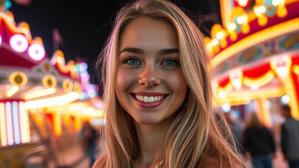 Hyper-realistic photo of a stunning 20-year-old blonde woman at a theme park, radiating beauty with captivating facial features under cinematic lighting, showcasing a perfect face. The scene captures the vibrant atmosphere with saturated colors, and despite minor imperfections, the image maintains an ultra-realistic charm. The setting exudes excitement, with her joyful expression highlighting the theme park's lively essence. Despite small creative modifications, the overall composition remains a masterpiece, blending reality with a touch of artistic flair.