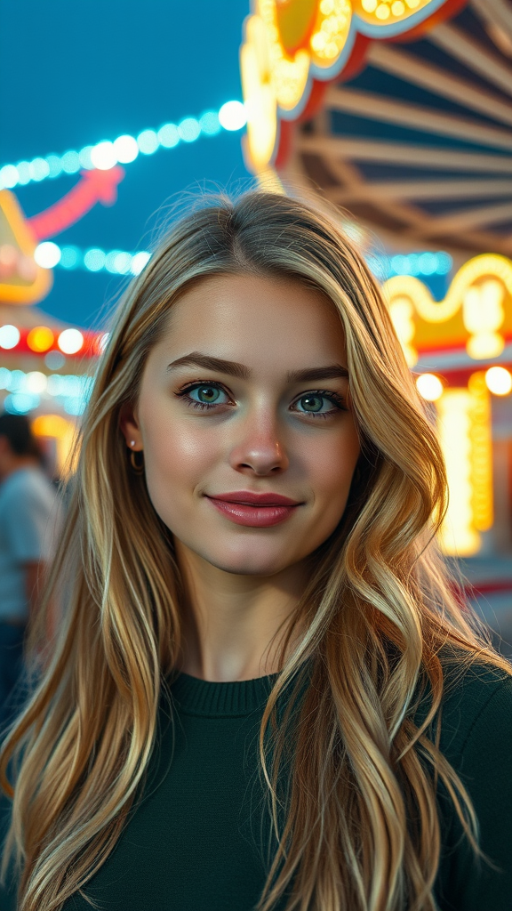 Hyper-realistic photo of a stunning 20-year-old blonde girl at a theme park, capturing her exquisite facial features and perfect face with cinematic lighting. The image showcases her beauty in an ultra-realistic manner, as a masterpiece visual. The picture emphasizes her natural charm within the vibrant, lively atmosphere of the park, exuding a sense of wonder and joy.