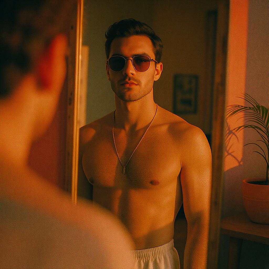 Hyper-realistic photo of an attractive man in stylish beachwear, sporting chic sunglasses, captured in a mirror using an iPhone 14. He has short, dark hair and stands in a cozy, vibrant room. The image features subtle film grain reminiscent of Kodak Portra 800, shot at f1.8 during the golden hour, providing a warm, inviting glow. The composition has an aspect ratio of 2:3, enhancing the intimate feel of the scene.
