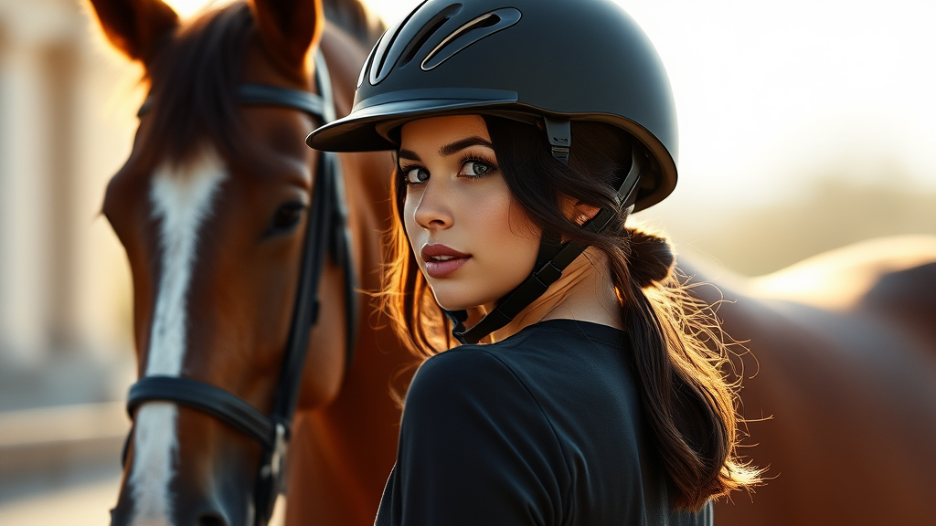 hyper realistic photograph, a modern young brunette female equestrian, glancing over her shoulder and wearing a sleek helmet as she prepares to embark on a tranquil ride with her chestnut horse, 8K, side profile captured in warm natural light, 2023, exquisitely detailed, shot with a Leica 50mm lens on Kodak Portra 800 film, enhanced chiaroscuro effect, f1.4 aperture highlighting delicate tones and textures