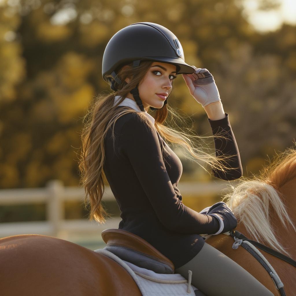 hyper realistic photograph, a modern young brunette female equestrian, looking back over her shoulder while adjusting her helmet, preparing for a leisurely ride on a chestnut horse, serene atmosphere, 8K, side profile, warm natural light, 2023, ultra detailed, captured with a Leica 50mm lens, Kodak Portra 800 film, masterful chiaroscuro effect, f1.4, soft shadows play across her face, capturing a moment of tranquility and focus.