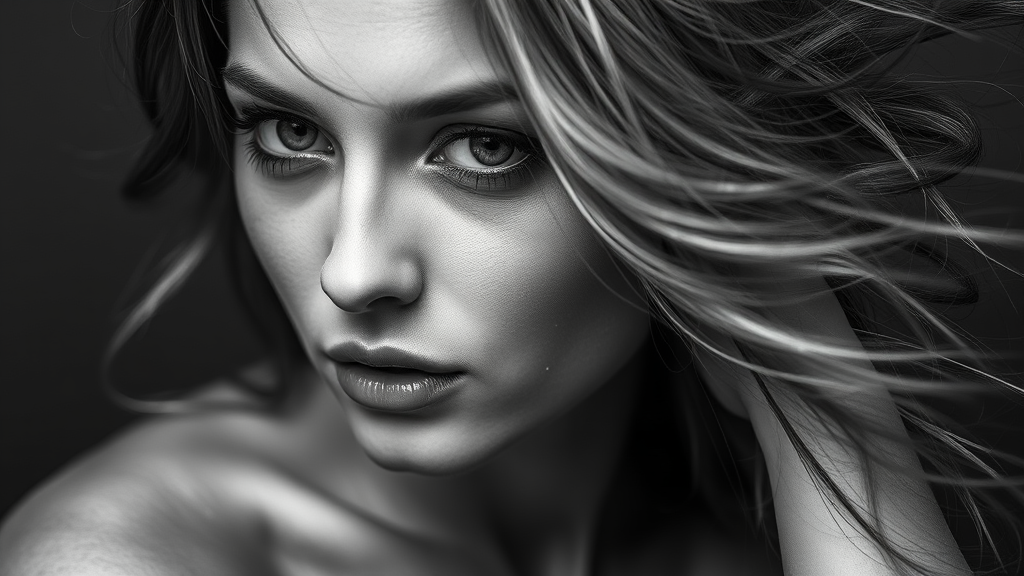 Hyper-realistic photograph, captivating woman, monochrome, captured with a Sony A7III, showcasing depth and elegance, high chaos, aspect ratio 1:2, personalized nuances, artistic stylization level 250, version 6. 1.