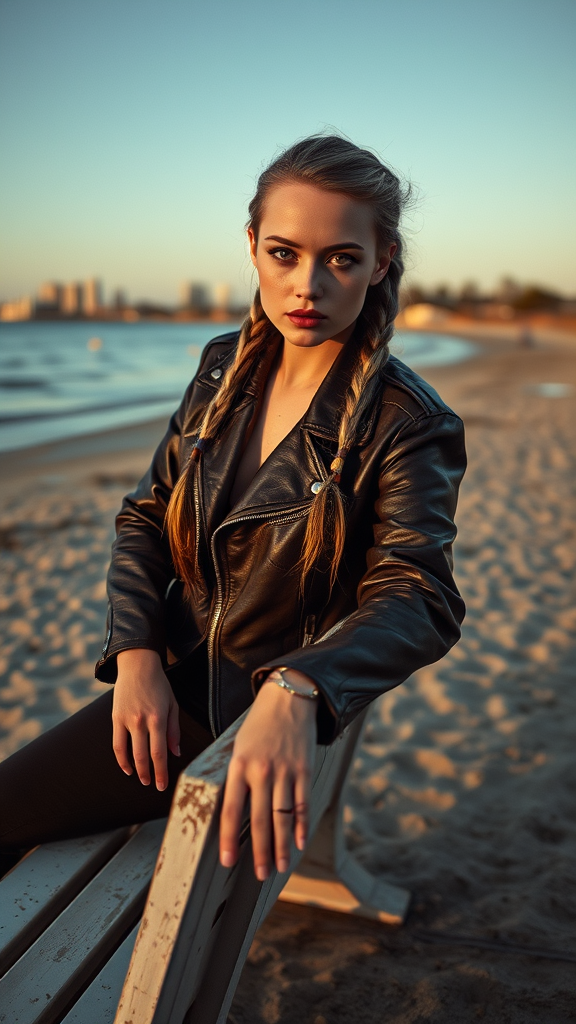 hyper realistic photograph, distressed leather jacket, long braided silver hair, melancholic eyes, striking model pose, light freckles, full body shot, perched on a weathered bench, sandy shore backdrop, bold makeup, captured on Kodak Portra 800 film, golden magic hour, urban skyline in the distance, aspect ratio 9:16
