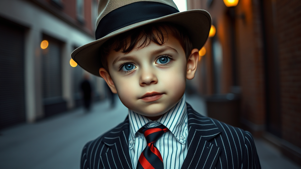 hyper realistic photograph of a child dressed as a mobster, 50 mm lens, soft film grain, Kodak Portra 800 colors, vintage ambiance, mischievous expression, classic fedora and pinstripe suit, urban backdrop with subtle shadows, warm and nostalgic vibe