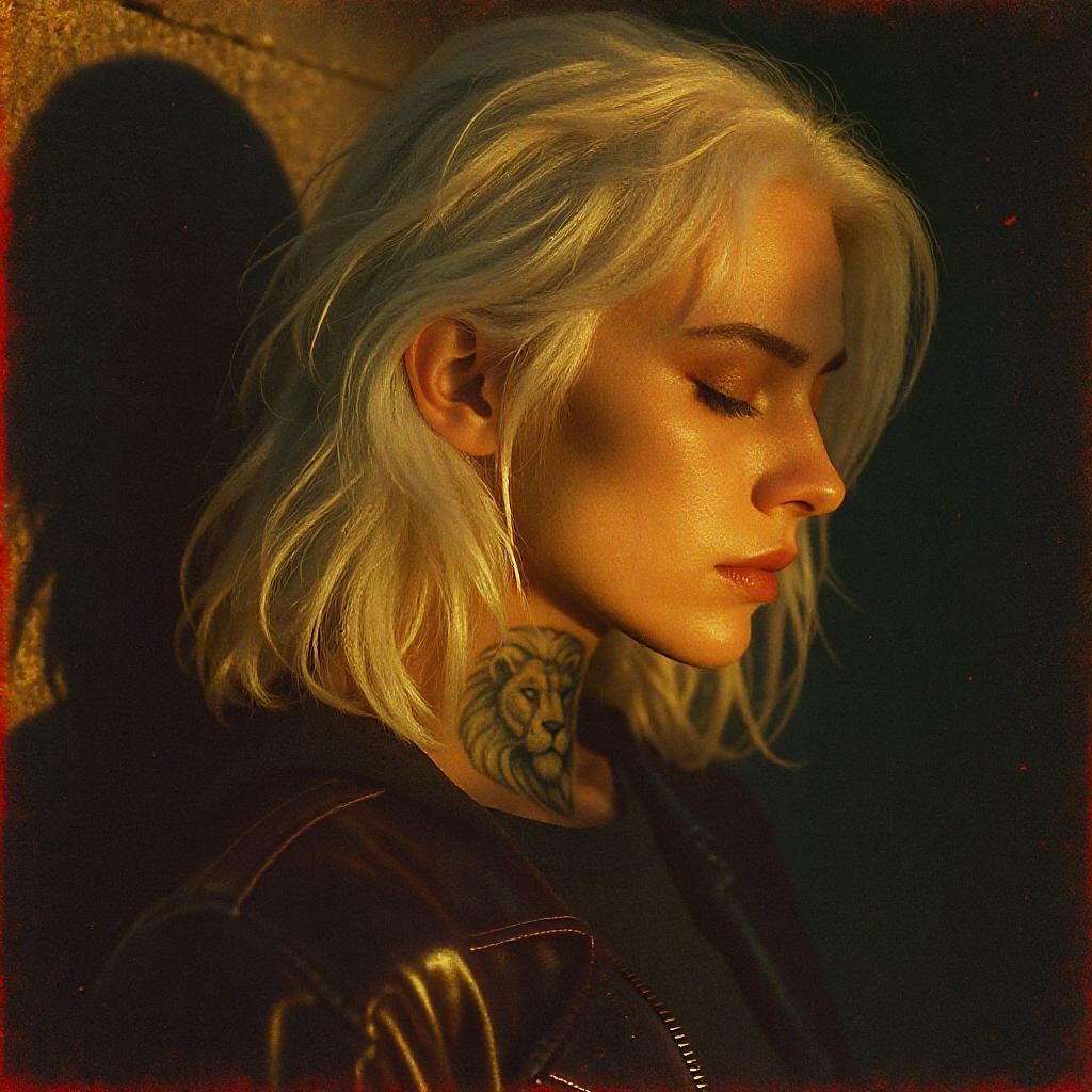 Hyper-realistic photograph of a European female model with a striking lion tattoo on her neck, embodying a future punk aesthetic. Her white hair shimmers in the summer light, enhanced by dramatic shadows. She gazes downward in a contemplative pose. The scene is captured with film grain reminiscent of a Leica 50mm lens and Kodak Portra 800 film, with the rich chiaroscuro effects enhanced at f1.4 during the golden hour, casting a warm glow over her features. The composition creates a powerful juxtaposition of modern edginess and classic photographic techniques.