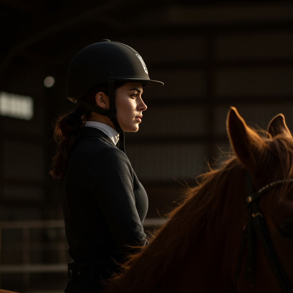 Hyper realistic photograph of a modern brunette female equestrian, her hair tucked into a helmet, casually glancing back as she prepares for a tranquil ride on a chestnut horse. The scene captures a serene side profile in natural light, emphasizing the detail and warmth of 2023. Shot with a Leica 50mm lens on Kodak Portra 800 film, it showcases ultra-detailed chiaroscuro effects at f1.4 aperture, highlighting the rich textures of the scene in 8K resolution.