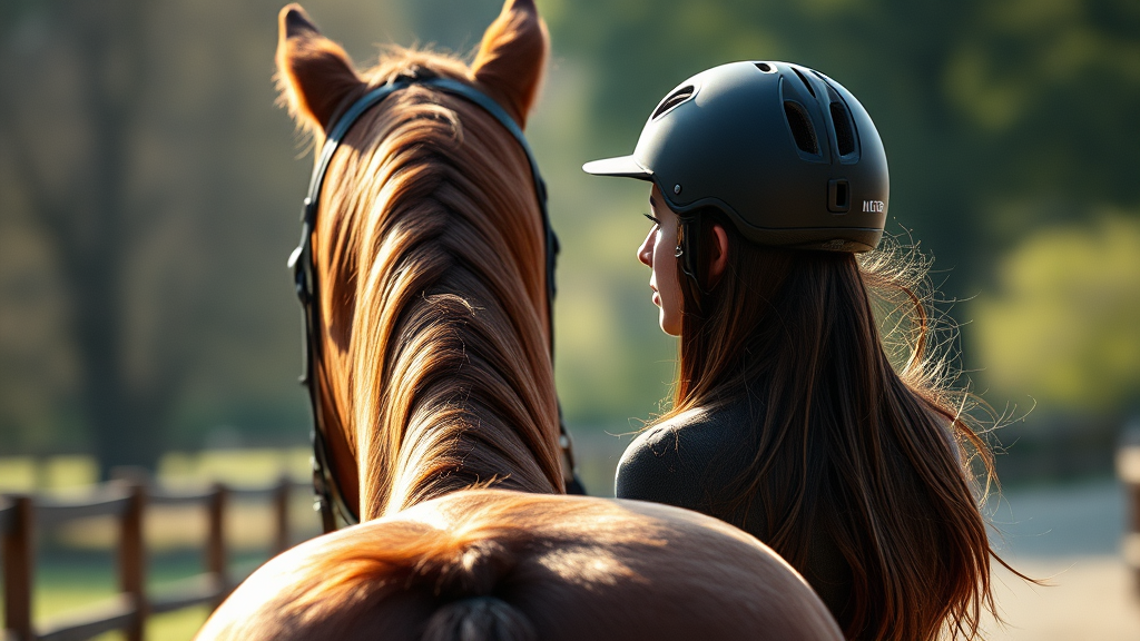 Hyper realistic photograph of a modern young brunette female horse rider facing backwards, wearing a helmet as she prepares to ride a chestnut horse on a tranquil walk, side profile, captured in soft natural light, 2023, ultra detailed, using a Leica 50mm lens with Kodak Portra 800 film, chiaroscuro effect, set at f1.4. The scene portrays a serene atmosphere with subtle sunlit highlights on her face and the horse's coat, enhancing the intricate textures and expressions.