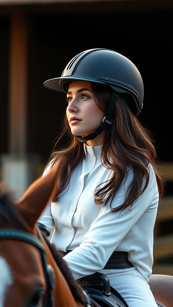 hyper realistic photograph of a modern young brunette woman in equestrian attire, gazing thoughtfully to the side while seated on a brown horse, helmet securely on, as they prepare for a tranquil ride, captured in 8K with natural lighting, 2023, ultra detailed with rich textures, shot using a Leica 50mm lens on Kodak Portra 800 film, exhibiting a chiaroscuro effect, shallow depth of field at f1.4, evoking a sense of serene anticipation.